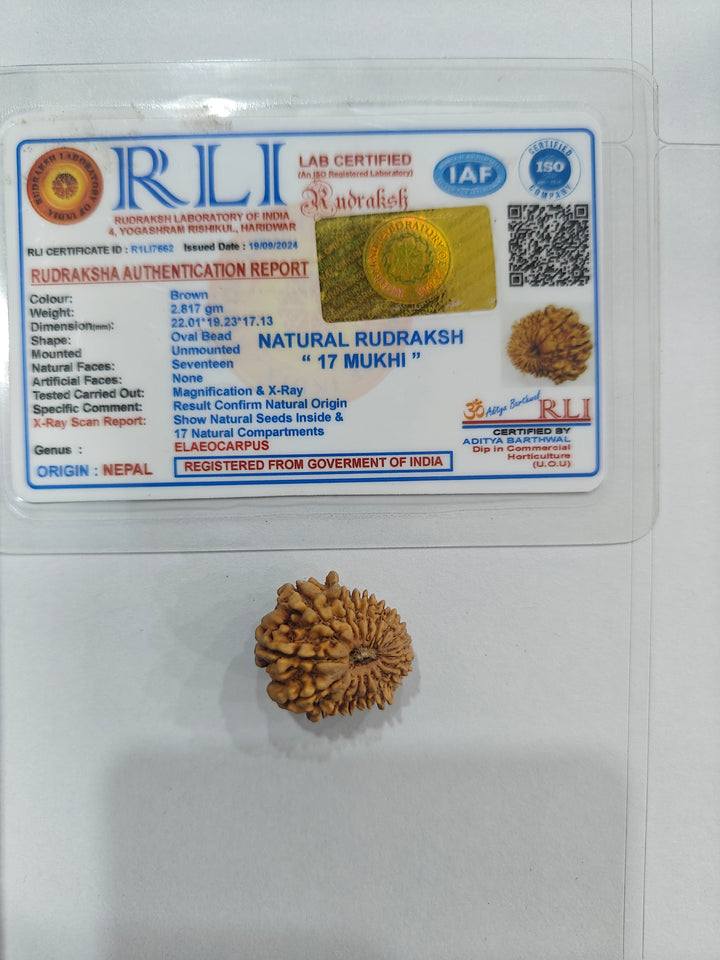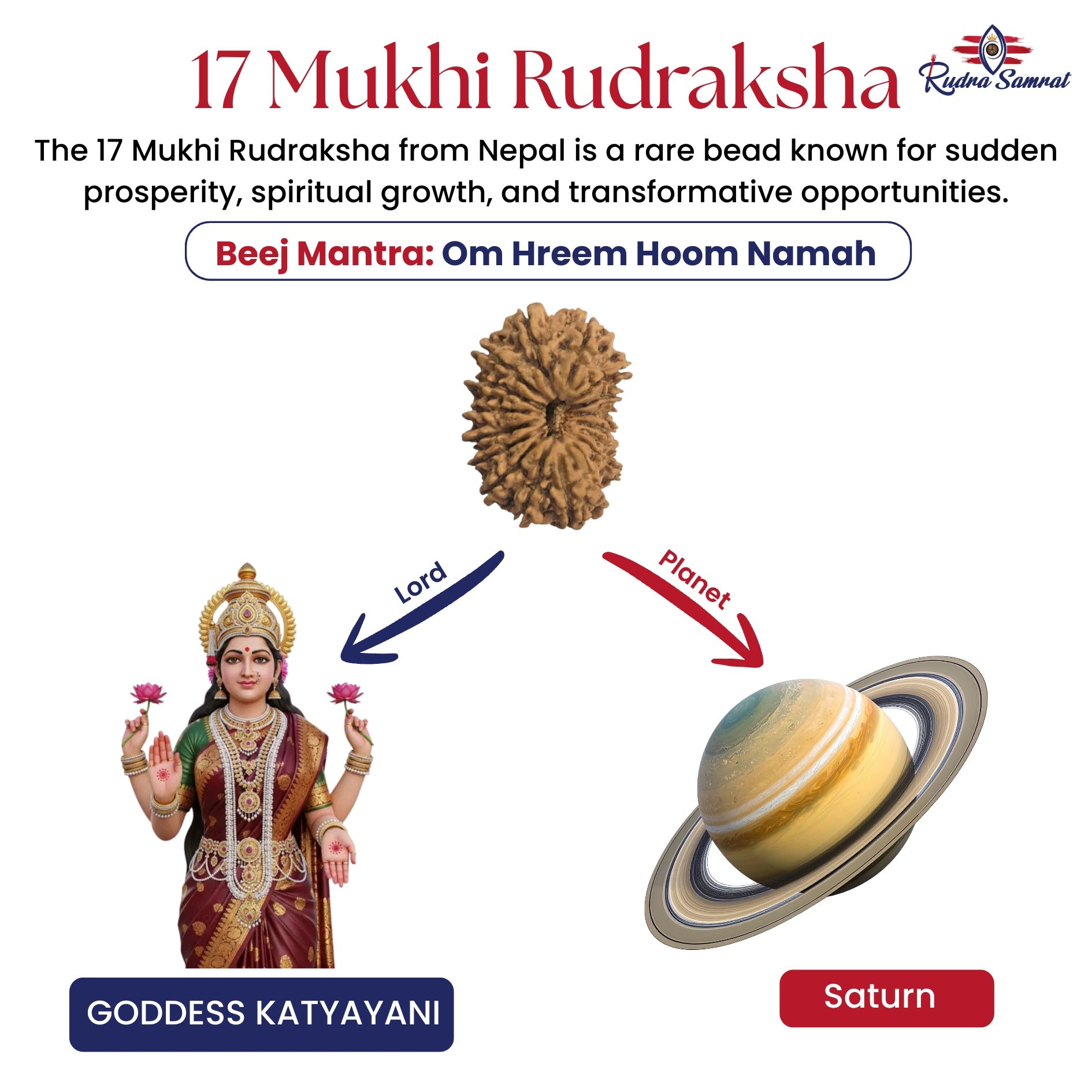 The 17 Mukhi Rudraksha is also connected with Goddess Katyayani, bringing blessings of abundance, fulfillment of desires, and divine protection.